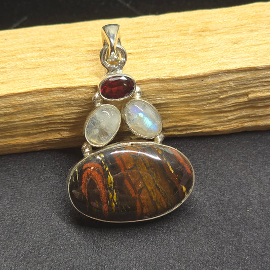 Red Tiger’s Eye, Moonstone & Garnet Pendant | Alloy Setting