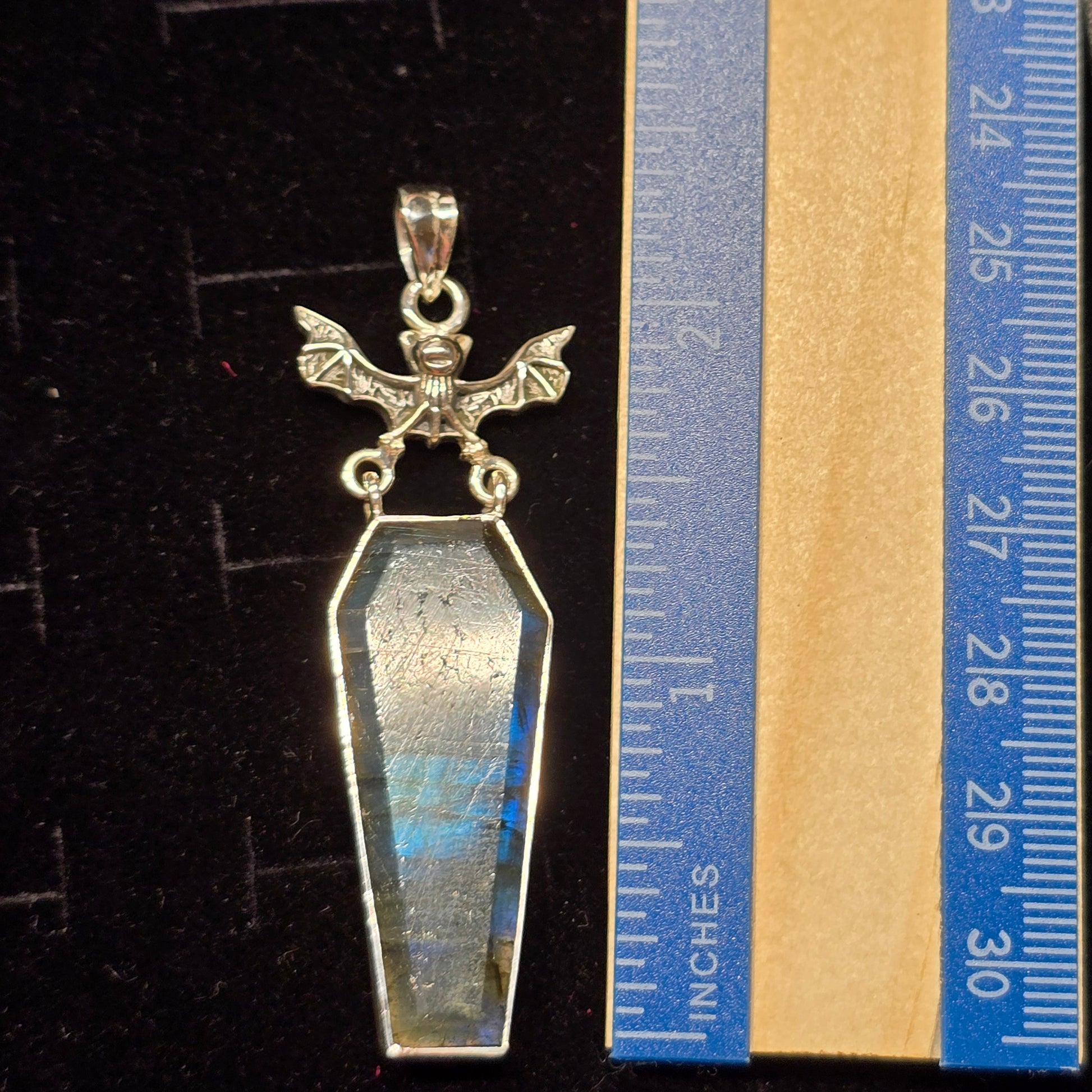 Labradorite Coffin Cut Pendant with Bat Detail | Sterling Silver (S925)