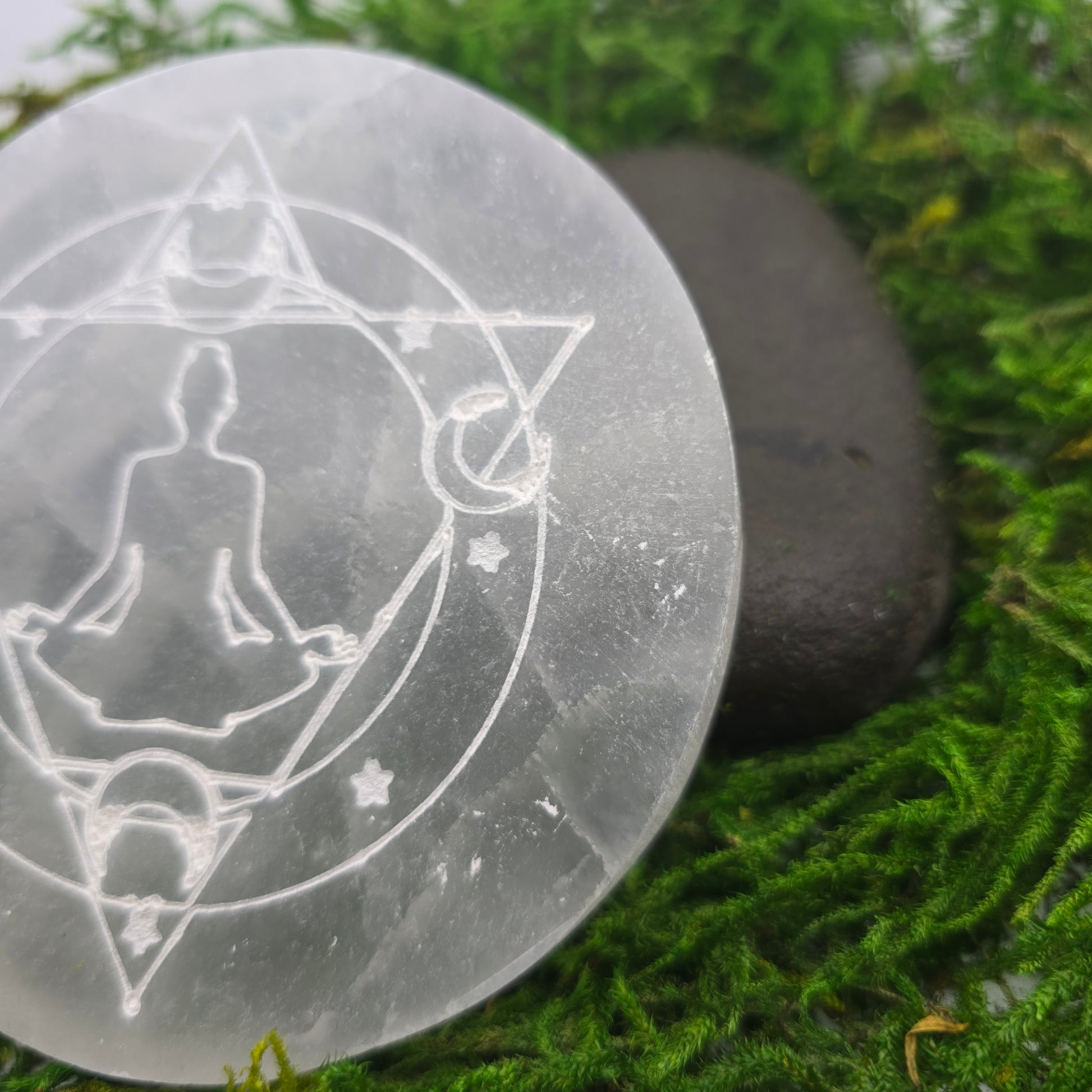 A polished selenite decorative plate engraved with a meditating figure design. Each piece features soft translucence and natural surface variations, making every plate unique.