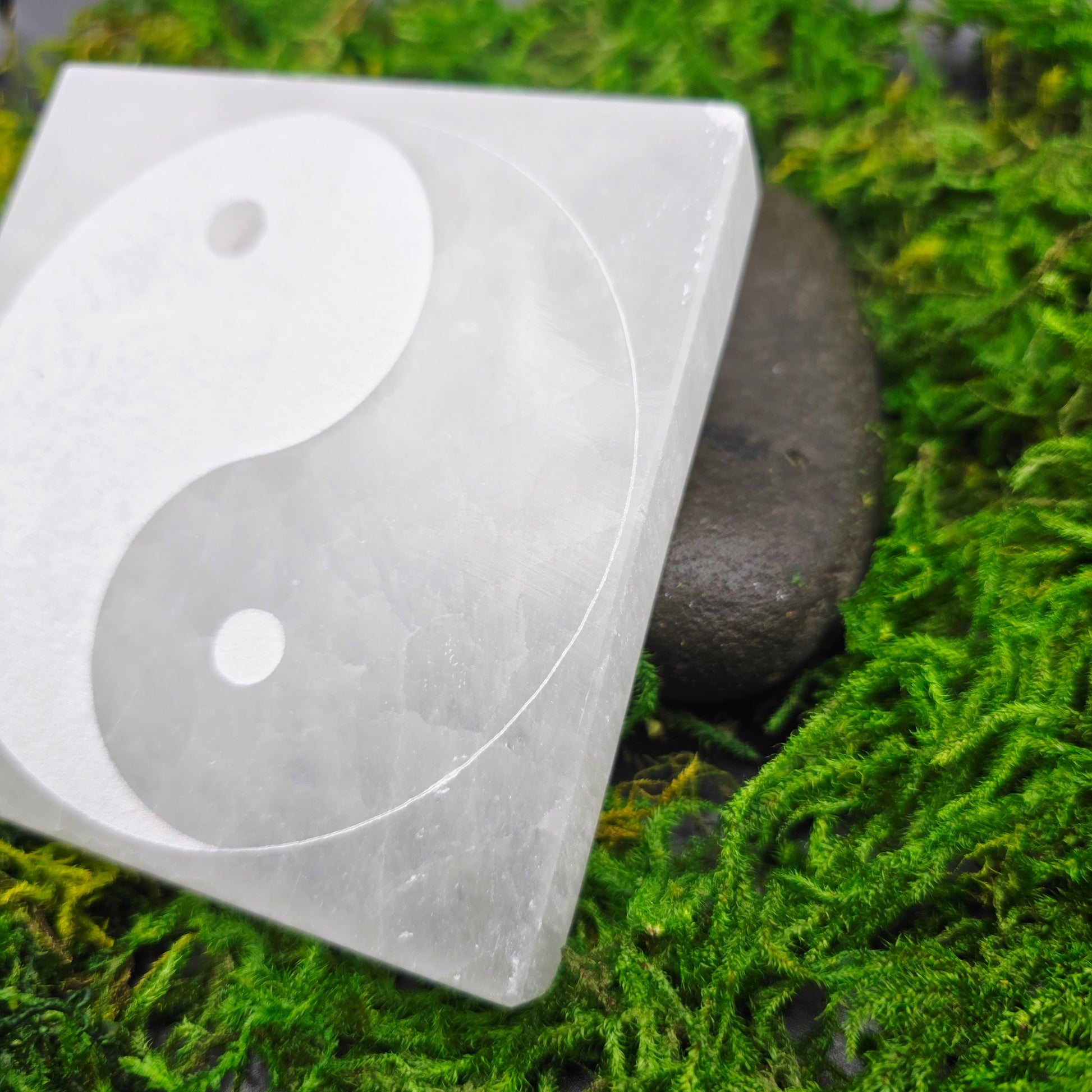A polished selenite decorative plate engraved with a yin yang design. Each piece features soft translucence and natural surface variations, making every plate unique.